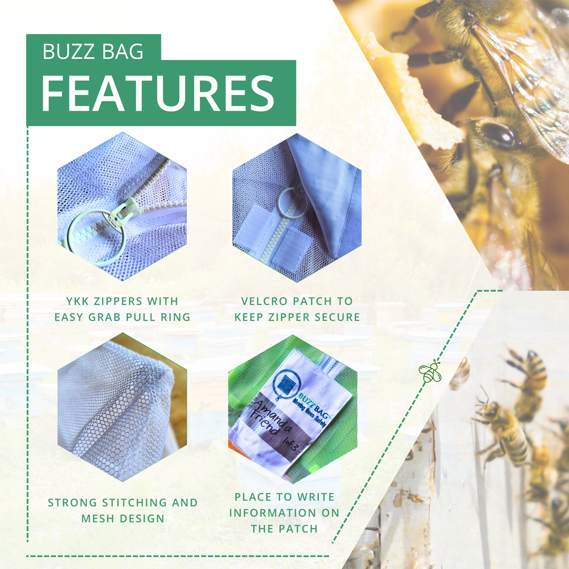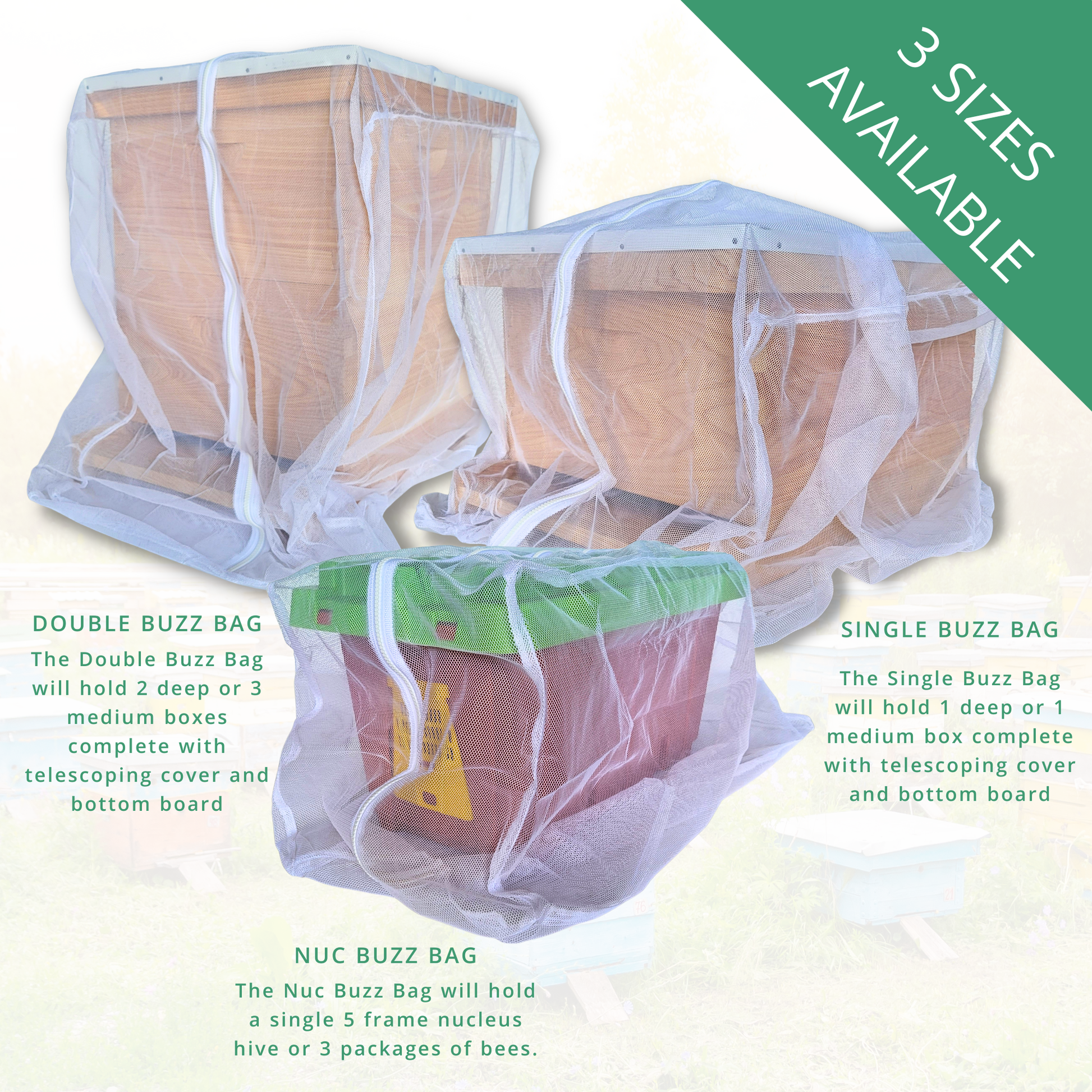 The Buzz Bag is an essential tool for beekeepers, designed to securely contain honey bees during transport from packages to nucs all the way up to full size hives. With its zippered mesh construction, this bag provides a reliable solution for moving bees between locations, ensuring their safety and yours throughout the journey.